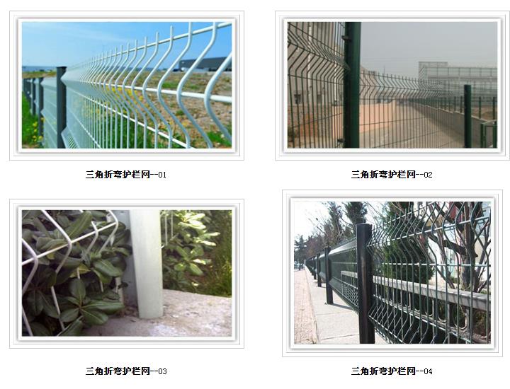 三角折弯护栏网常见规格:浸塑丝径:4.0-6.0mm 网格尺寸:50mm x180mm 60mmx200mm 桃型立柱尺寸:50x70mm 70x100mm 厚度1-2mm 网片尺寸:2.5mx3.0m 加强筋:三道折弯或四道折弯:结构:用高强度冷拔丝与低碳钢丝焊接后经过液压成型,用链接附件与钢管支柱固定。